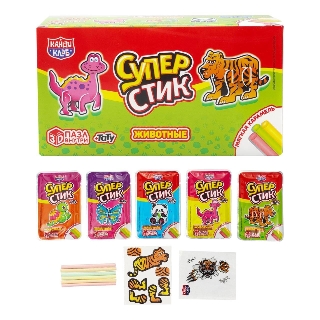 Мягкая карамель с игрушкой и татуировкой "Супер Стик с 3D пазлом" (животные) 5 гр. 40 шт. уп.