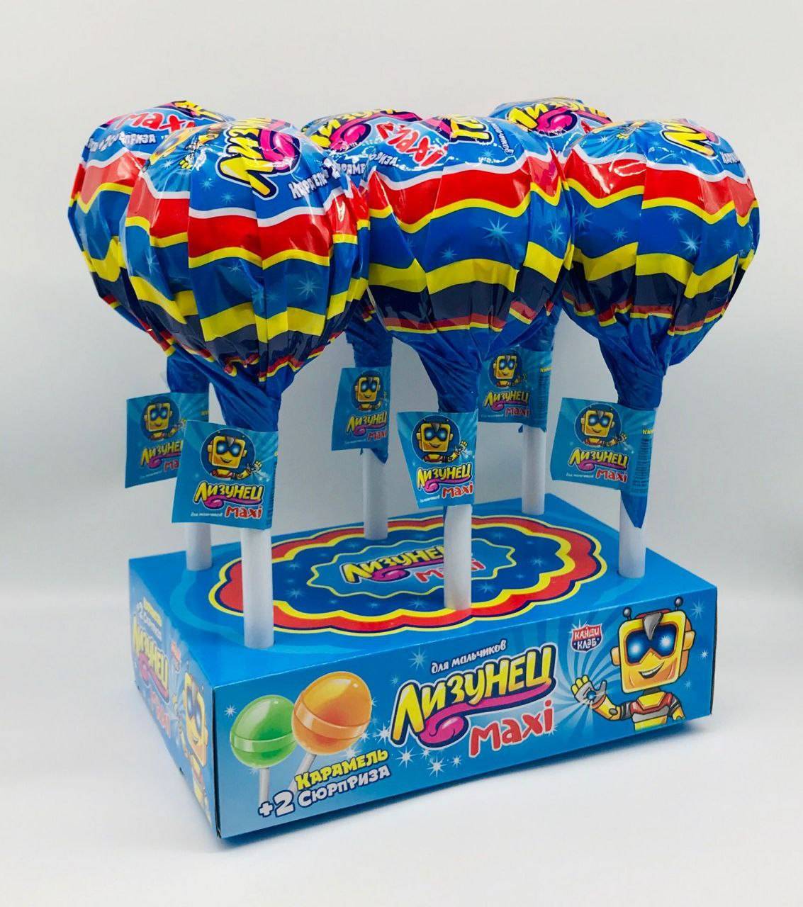 Лизунец MAXI. Карамель на палочке с жевательной резинкой и подарком в наборе (для мальчиков) 125 гр.