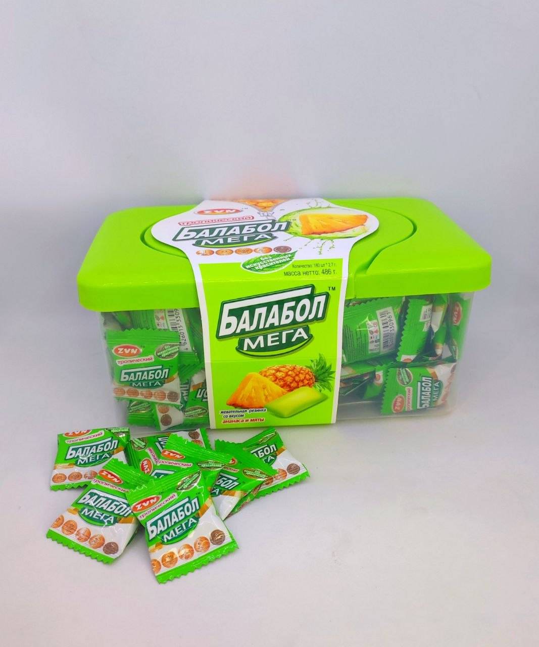 Жев. резинка«ТРОПИЧЕСКИЙ БАЛАБОЛ МЕГА»со вкусом ананаса и мяты 486г (2,7г*180шт)